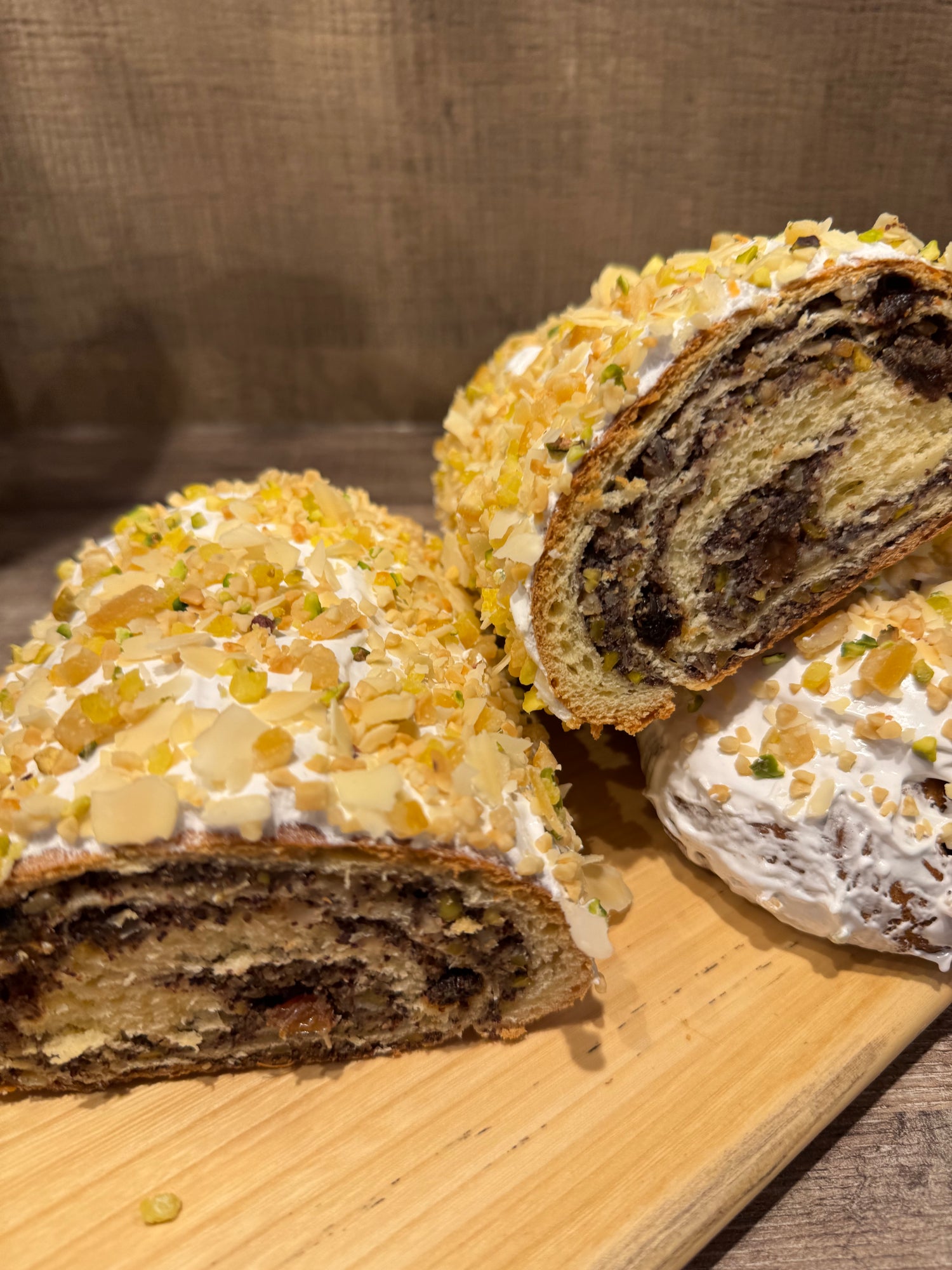 Makowiec premium na drożdżowym cieście z włoskiej mąki typ 00, wypełniony bogatą masą makową z miodem, rodzynkami, orzechami włoskimi, laskowymi, pistacjami i skórką pomarańczową. Ręcznie zwijany, dekorowany chrupiącą posypką z migdałów i orzechów, polany delikatnym lukrem – elegancki, naturalny i w 100% świąteczny, dostępny wyłącznie w limitowanej świątecznej serii.